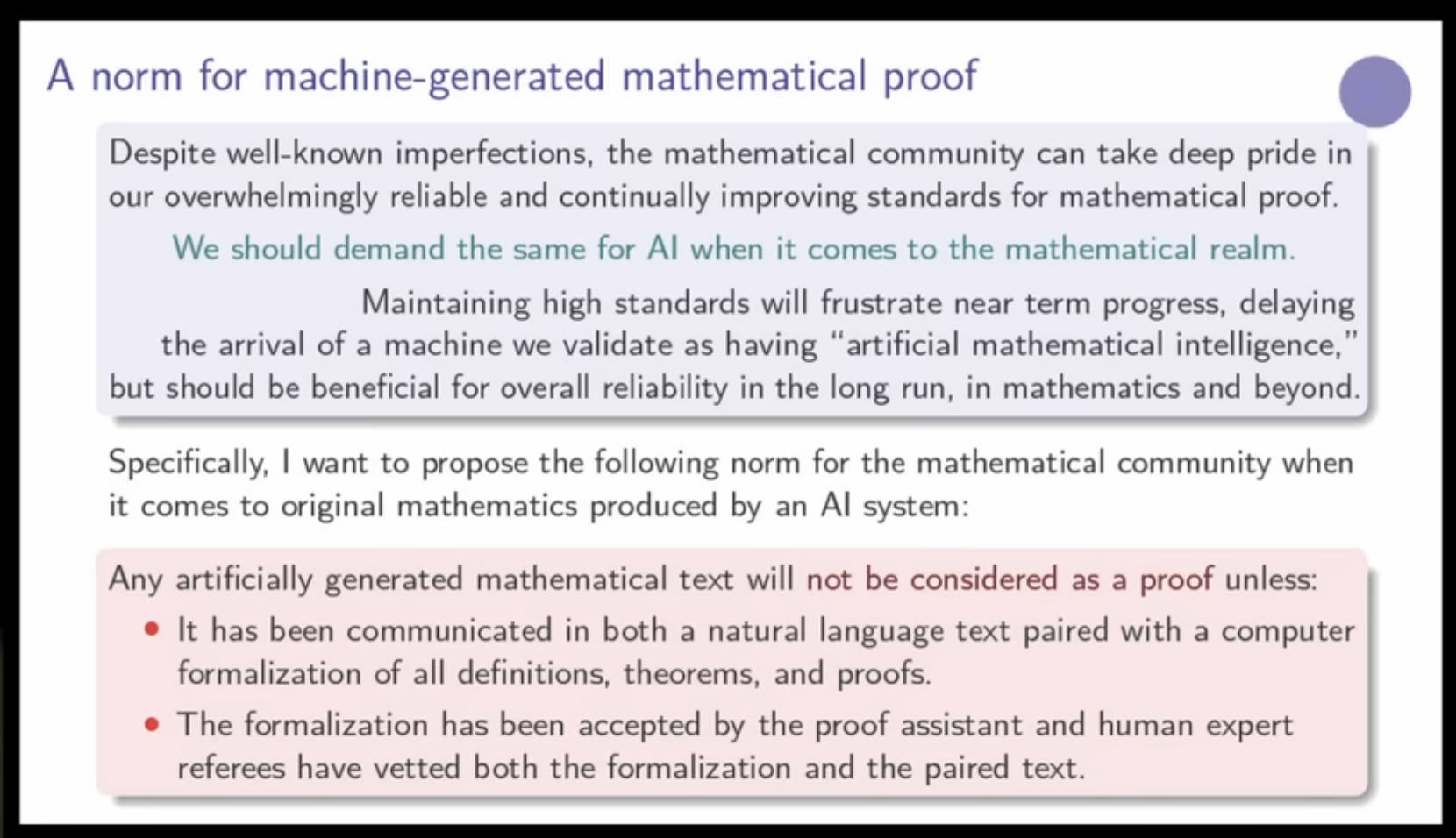 I assume the human-generated proofs will not be subject to this standard. So one practical challenge I see is deciding whether a mathematical text has been artificially generated.