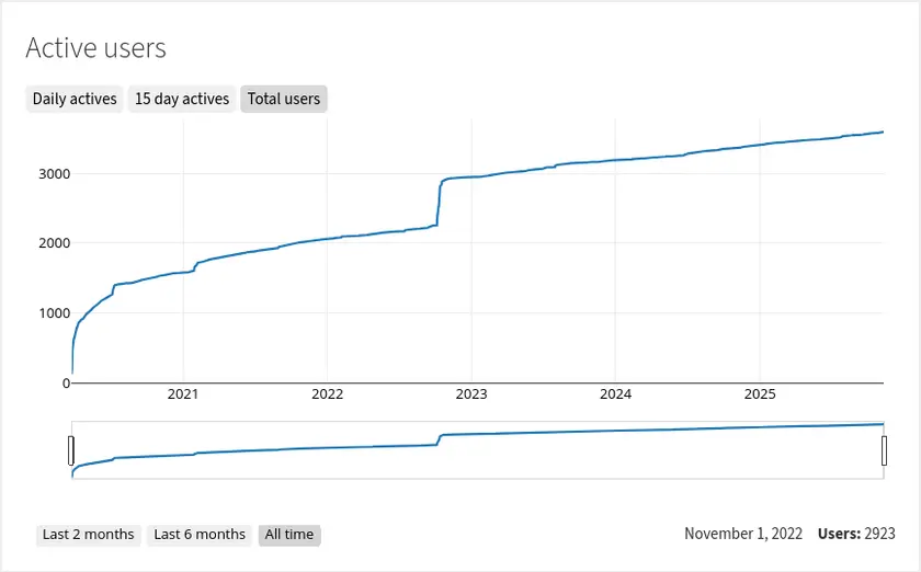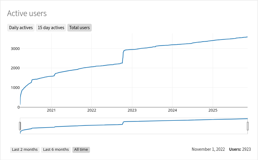 There was a jump in sign-ups when we hosted the CT4AI workshop chat. I'd wager most of those users never stuck, which means there is a ~700 excess to account for. Still, pretty high!