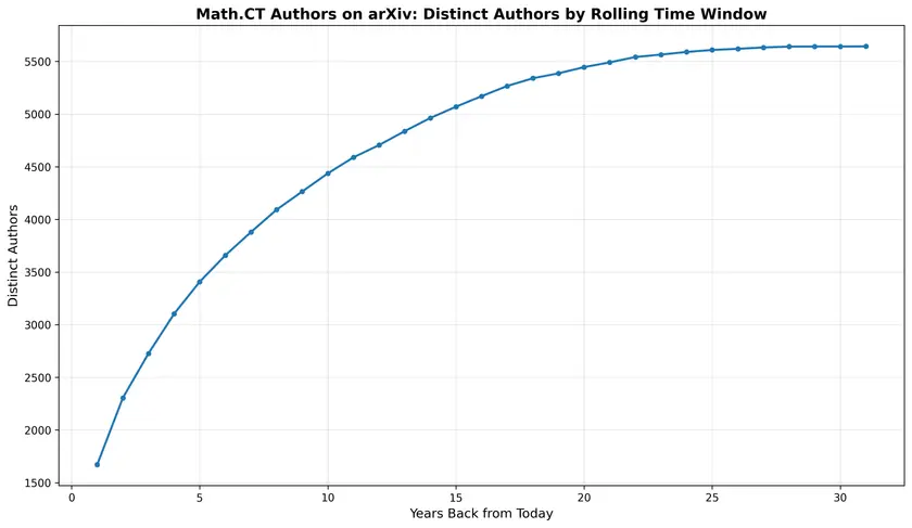 I think that between attrition (early career) and retirement (late career), the underestimate that only asking for primary subject code gets you, and the extra you'd get from authors who only use math.CT as a secondary code, it would all roughly even out.