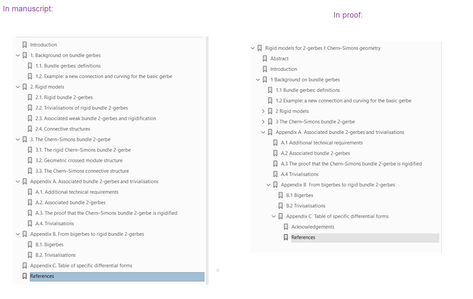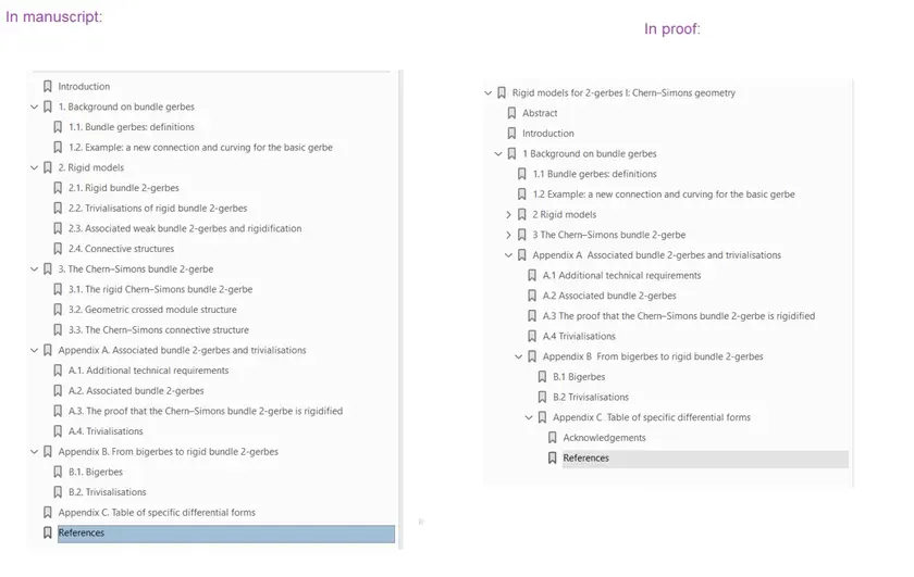 Anyway, I've been editing a Springer publishing agreement for them this morning, and dealing with their outsourced typesetting company that apparently can't get my point that the right hand pdf contents hierarchy here is incorrect and needs to look like the left hand one