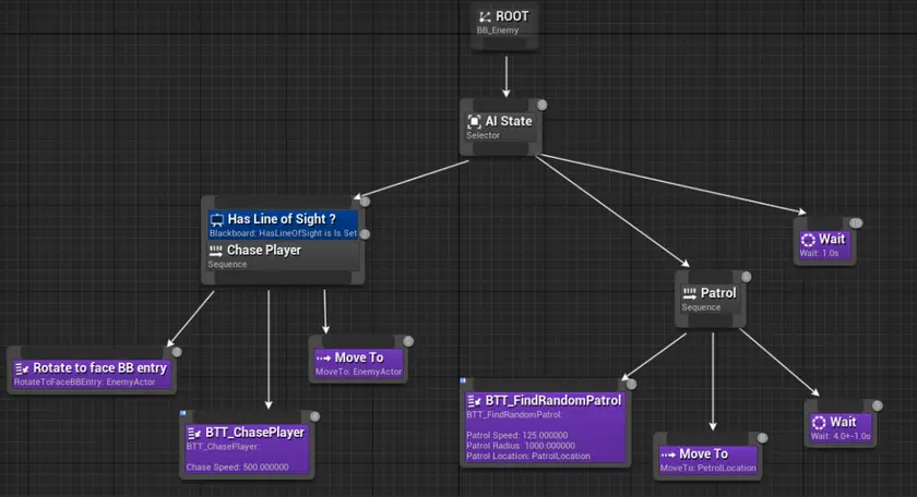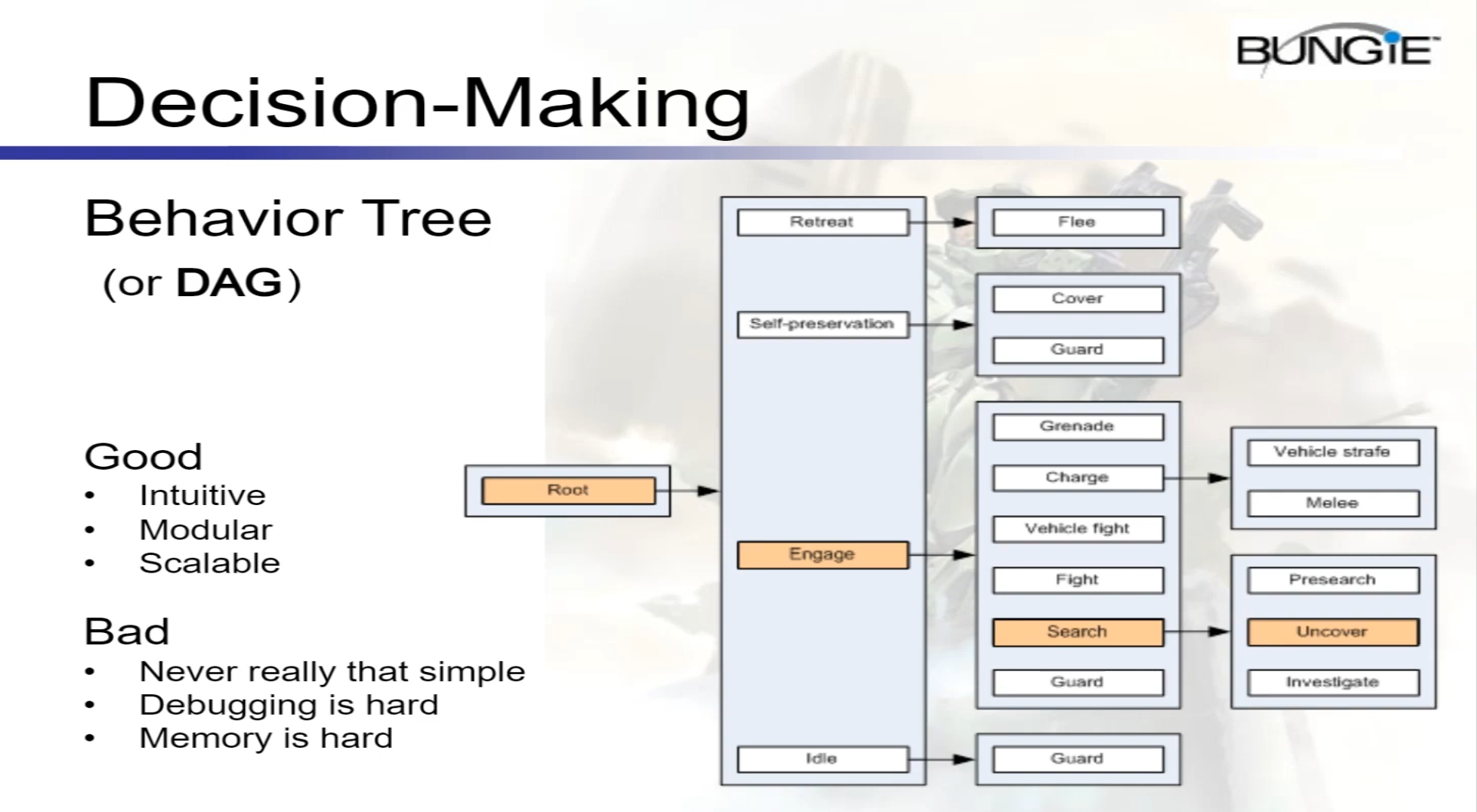 When I first heard about them I couldn't tell what would make them different from FSMs, except for maybe the layout. The idea is to lay out a pattern of behavior that's executed according to certain primitives. The nodes have access to a pool of state, and the tree keeps being executed from root to some leaf where an action happens, potentially many times a second.