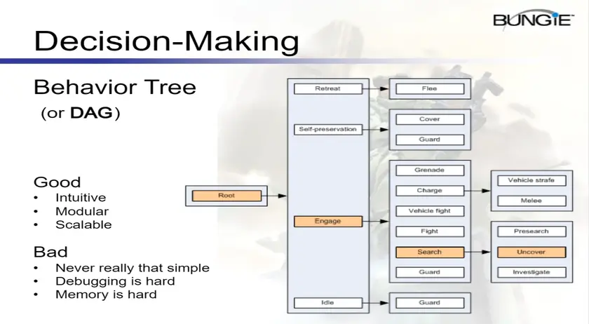 Behavior Trees were popularized by the following GDC talk on the AI in the video game Halo 2: https://www.youtube.com/watch?v=m9W-hpxuApk