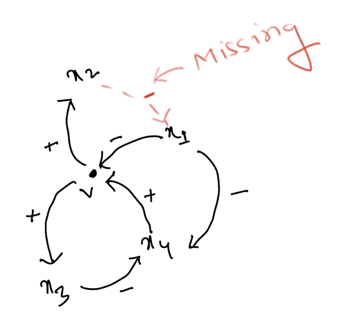 There are difficulties with this idea as soon as our graph has directed cycles, because then the sum can become infinite. And the graphs usually do have directed cycles, as in the picture above. That's why they're called 'causal loop diagrams': people are interested in studying the 'feedback loops'.
