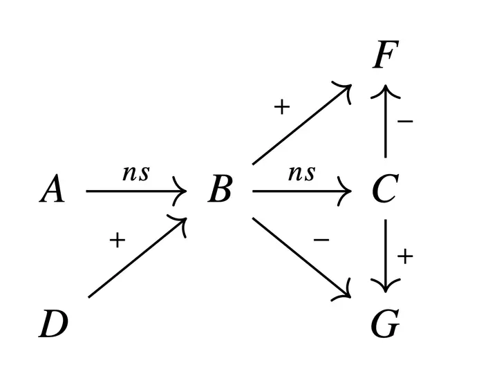 But here's the more substantial idea. We're calling elements of 'polarities' and using them to describe different ways in which one thing affects another. For example if is the group , an edge labeled by + means one vertex positively affects another, while an edge labeled by - means one vertex negatively affects another.