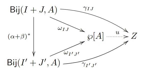 The component is induced by the image function, sending a bijection to the image of under , i.e. . This is a cocone as the diagram [Figure 1] commutes for every pair of bijections . It is also an initial cocone, as given another cocone for the same diagram, into another set , one can use the cocone condition on to prove that the function sending a subset to is (well-defined and) the unique fitting in the diagram [Figure 2] (the key observation is that every permutation decomposes as where : since the cocone condition can be phrased as the equality for every a permutation acting on and via the sum of two permutations acting on the summands of the the decomposition , one has that \emph{every} is of the form if and . But then, .