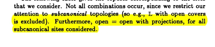 Yeah, the terminal sheaf on the given site would have to correspond to a manifold that admits one local diffeomorphism from each Even ignoring the fact that this manifold has every dimension at once, it would have to be rigid, whereas positive-dimensional real manifolds have enormous groups of smooth automorphisms. I can’t guess what you meant here, Dmitri.