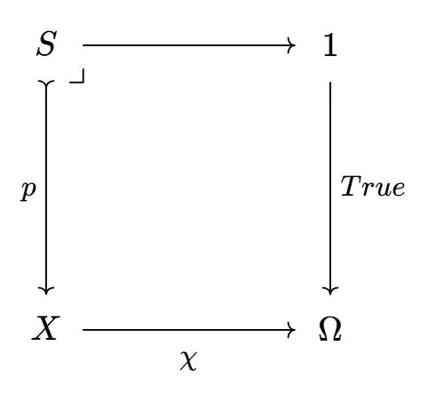 The contravariant power set functor of , , is just the monomorphisms into up to unique isomorphism. is representable in Set, which defines the subobject classifier : . After noting , we see this representability condition corresponds to the equivalence between injective functions and set families with at most one element.