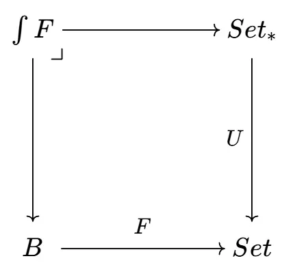 But when we step up from arrows to functors when looking at the pullback describing Set, their roles are reversed. The indexing functor looks like a generalized element picking out sets from Set, with it being wrapped into a bundle into B from .