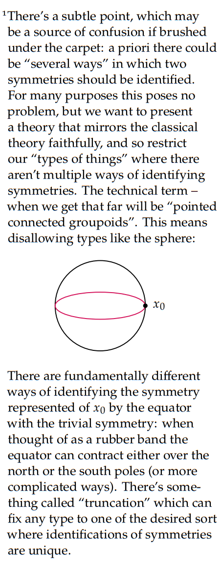 But I've been convinced my handle on the basic definitions is worse than I thought, so I looked up [[pointed connected groupoid]]. Happily, I found the book Symmetry by Marc Bezem, Ulrik Buchholtz, Pierre Cagne, Bjørn Ian Dundas, and Daniel R. Grayson.