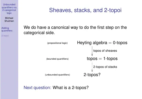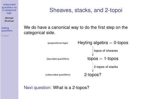 Then Mike joined the nCafe, and the last I heard of an explicitly categorified logic was his Stack semantics. It seemed to fit with the Baez and Dolan sense of categorification: