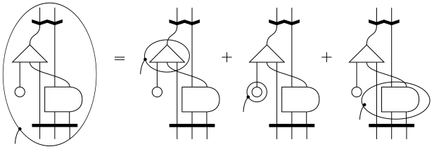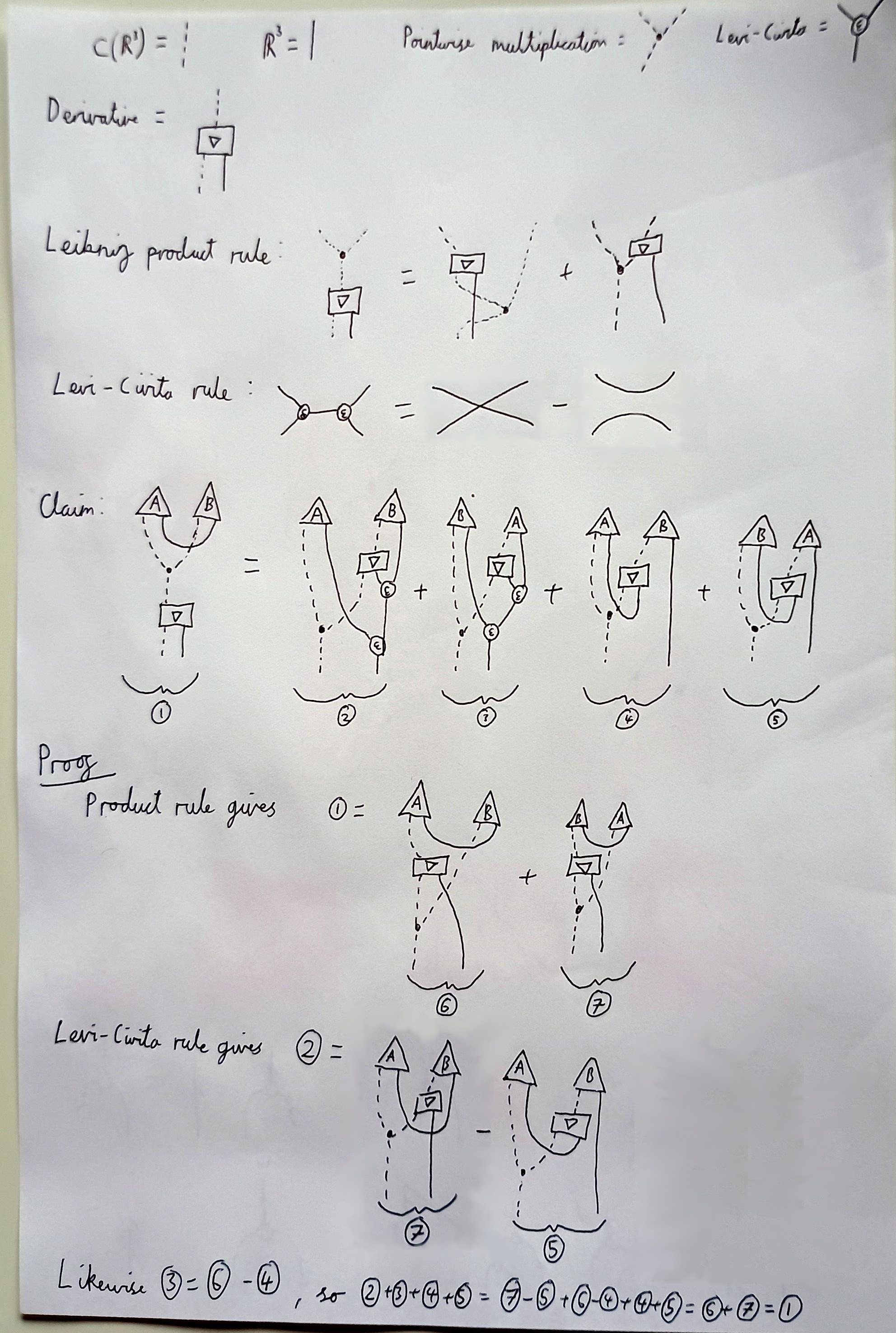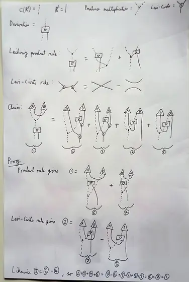On the other hand, I kinda hate these stupid 'bubbles' representing the derivative. I think you should be able to do the whole thing without them. Write for the real vector space of sufficiently nice functions on . Then have one kind of string in your diagram for , and one for . You can think of a vector field as an element of and represent it as a box in the string diagram with one of each kind of leg. Then the derivative is just a linear map , and everything becomes normal string diagram manipulations with no bubbles.