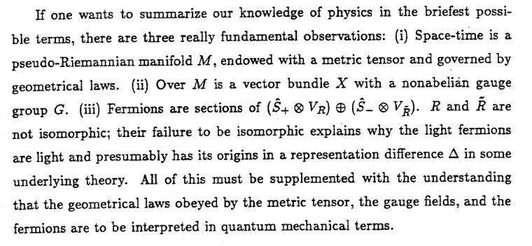 By "all of our knowledge of physics" I meant according to Ed Witten's Physics and Geometry. Below are the explicit structures that I meant by that.