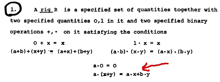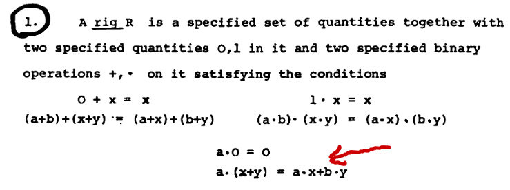 Reading into the first chapter, we get to Lawvere's definition of rig. Interestingly, Lawvere chooses the "four-variable combination of the commutative and associative laws" such as for addition, but I notice that he only makes explicit one side of the unit laws, such as . It's not immediately obvious to me how to prove that from here, which is needed to deduce associativity and commutativity from the four-variable axiom. Am I missing something?