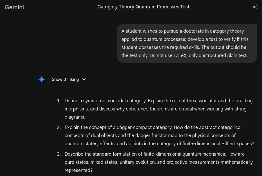 A student wishes to pursue a doctorate in category theory applied to quantum processes; develop a test to verify if this student possesses the required skills. The output should be the test only. Do not use LaTeX, only unstructured plain text.