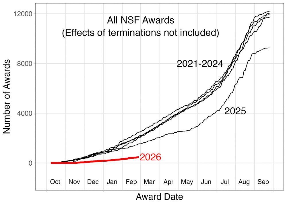 "Until recently": Trump tried to dramatically cut NSF grants, sometimes after they were already awarded. Congress and the courts reinstated most of those grants, but the administration (under Trump's control) has been slow-walking those grants, so the rate at which this year's grants are being given out is much lower than previously: