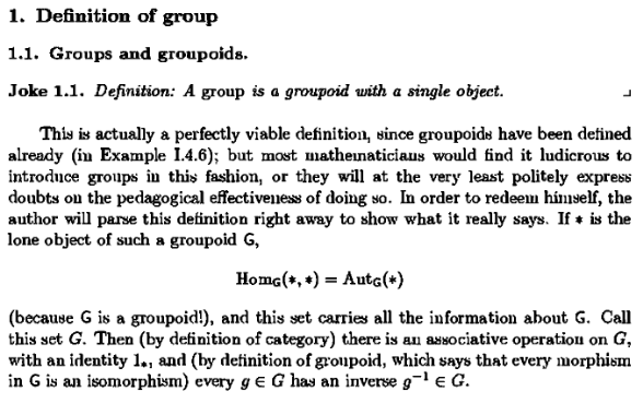 I wonder if he points out that a group is a category. This could break students' brains if done wrong, but ultimately it's the kind of "level shift" that's worth mastering.